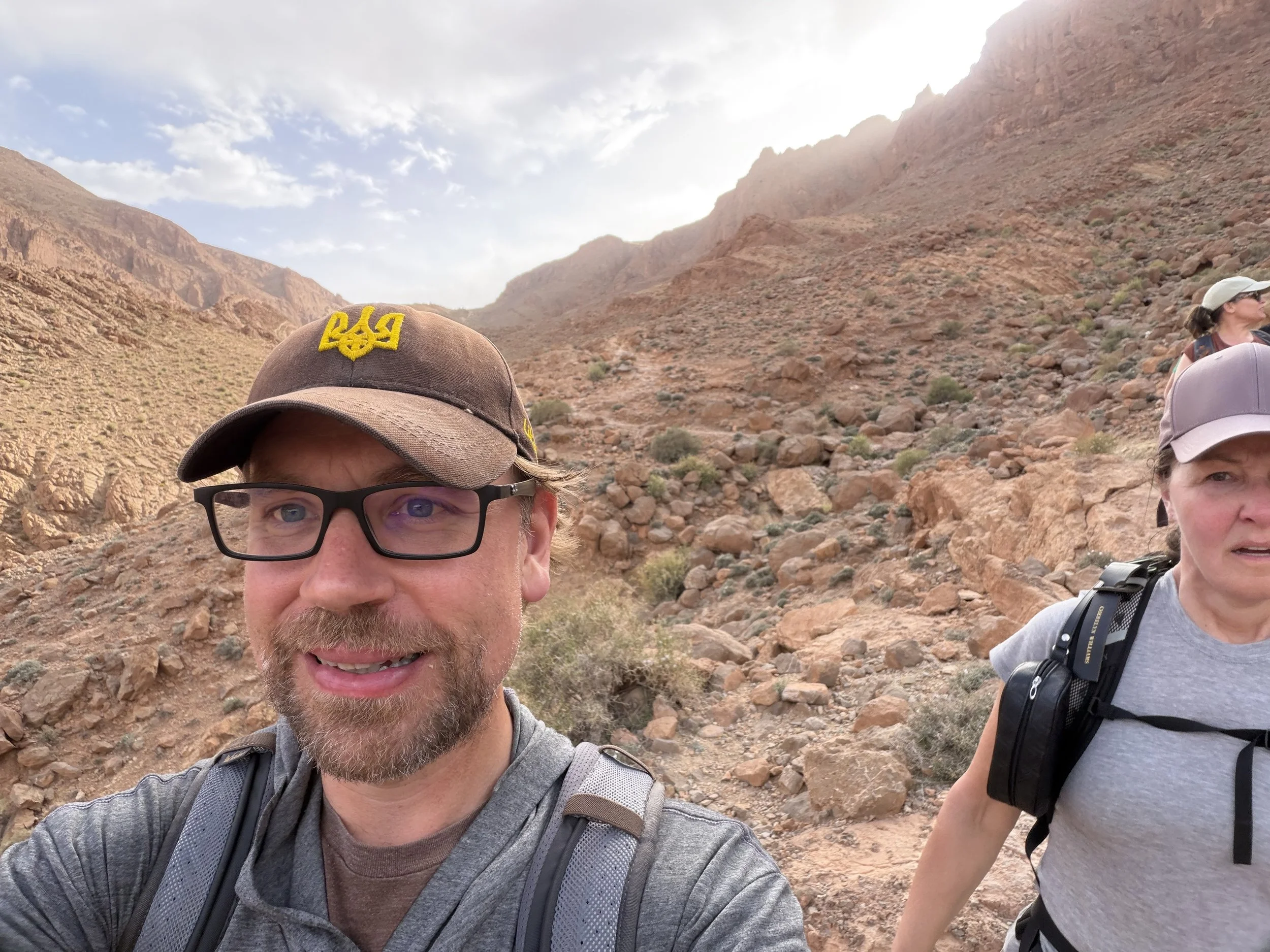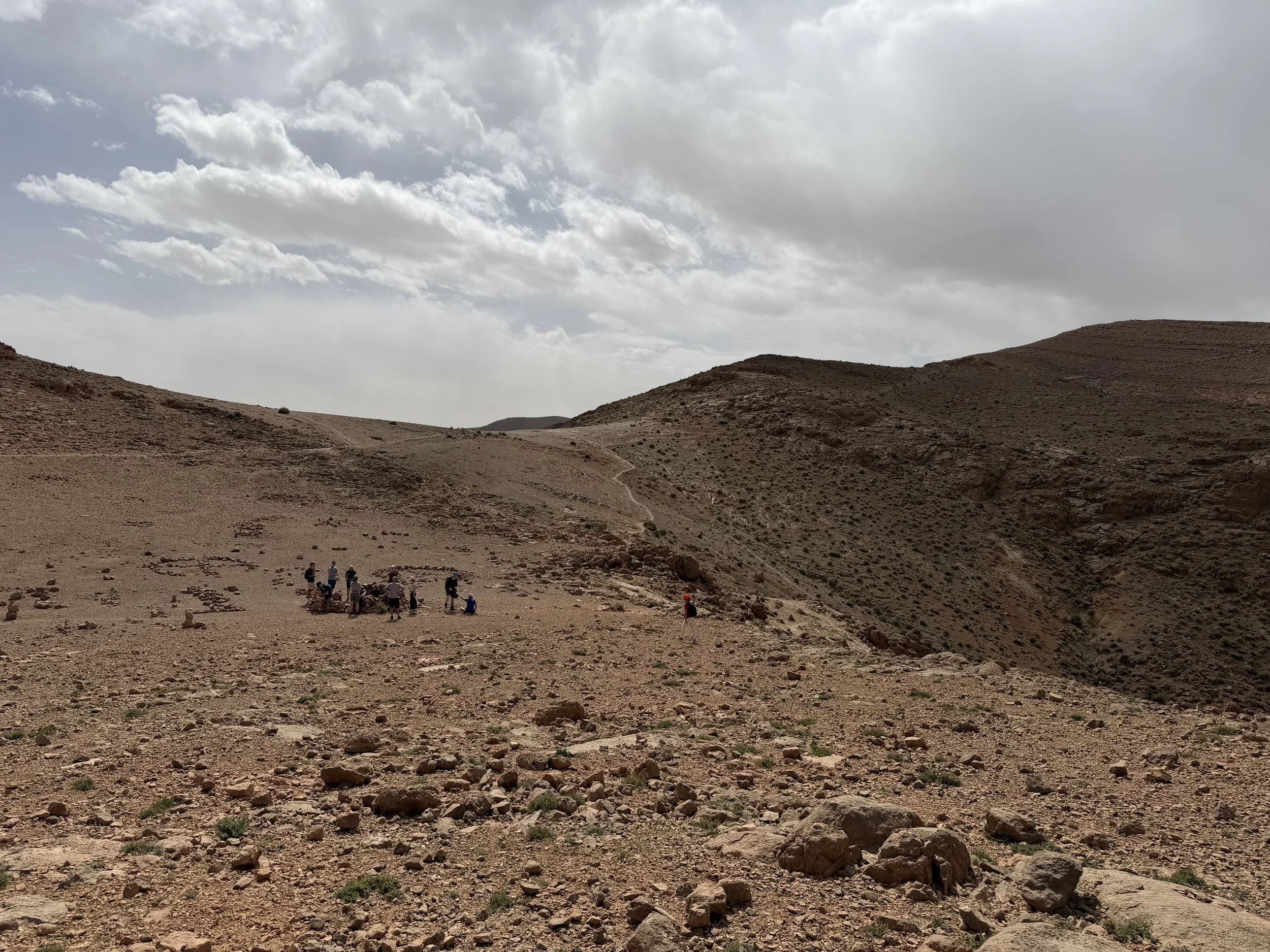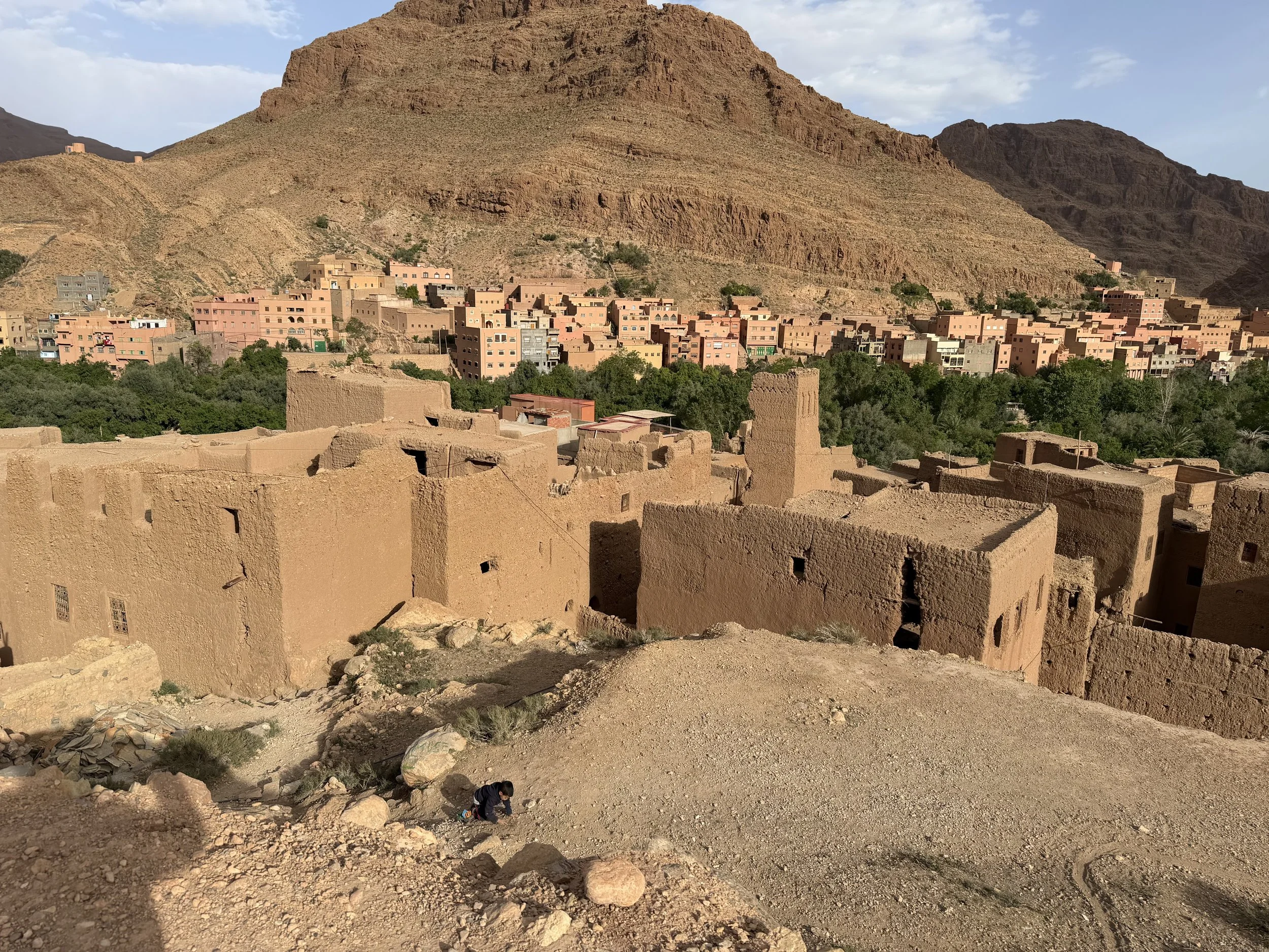 Today we woke in our Saharan tent home and I went out for a private walk around the sand dunes. Then we watched the sunrise over the dunes. A nice older Moroccan man helped me take a bunch of pictures and then, sadly and predictably, asked me for money. Breakfast was your standard fare, then we hopped on buses and drove away from the desert. After a few tourist-y stops, we arrived in the Draa Gorge for our longest hike of the trip, a 6-mile and 4-hour hike up and around the Gorge, which reminded me of Red Rocks or of Utah. About 2/3 of the way up the gorge we encountered our first Nomad family, living in and around the trail in literal caves, and farming goats, the youngest of which were still in a small enclave built of rock, and the older ones littered around the hillside, with an elder watching them. This subsistence lifestyle still exists up here. It was cool but I also I felt very odd and conspicuous essentially parading past these humans as if they were a zoo exhibit. The hiking was great and I feel like I finally got a chance to really stretch my legs a bit. I honestly would have preferred even more hiking, both today and on this trip in general. I think the problem is that we’re spending a lot of time in buses so there just isn’t much time for it.